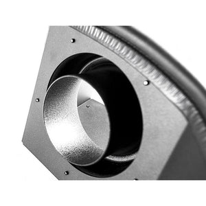The air intake utilizes a high-flow bellmouth behind the air filter to deliver as much air as possible. This bellmouth design increases the air velocity to the MAF and pulls cold air equally from all directions into the filter. This bellmouth is securely fastened to the heat shield as a clean pass-through providing a solid mount for the air filter and turbo inlet pipe. You have no worry about the intake pipe moving around and causing damage unlike other intake kits on the market, which simply clamp the filter onto the end of the inlet pipe or MAF. Furthermore, the bellmouth opening allows for a filter with a very large surface area that can support any horsepower goal. The same filter and bellmouth design have been tested to support over 500HP!