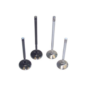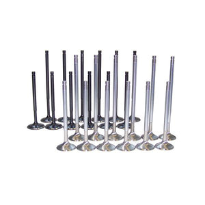 Valve set for the 24v and R32 motors, stock size for the R32. Back cut and swirl polished valves for higher flow. Intake valves are stainless steel with a nitride coating, exhaust valves are Inconel for turbocharger use.