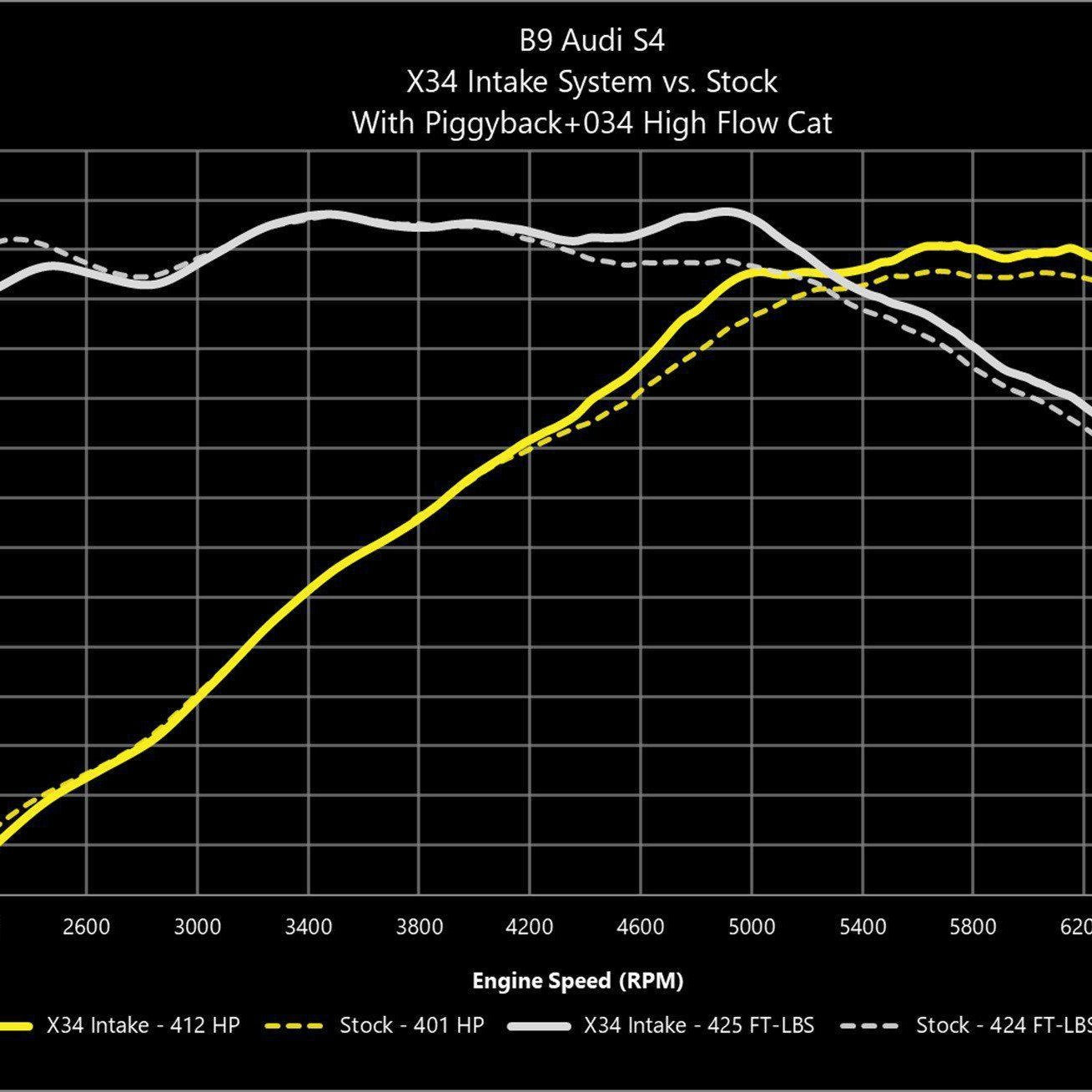 Test Conditions: Dyno testing was performed on a stock 2018 Audi S4 3.0 TFSI using 91 octane fuel, piggyback, and 034Motorsport High Flow Cat.