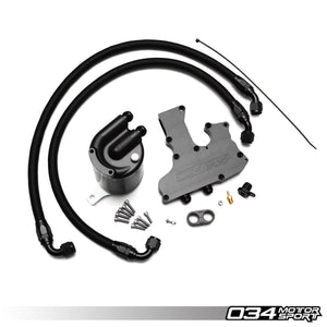 The 034Motorsport Transverse 2.0 TSI Catch Can Kit is here! We've put months of engineering and testing to create the most complete and effective catch can kit on the market. The 034Motorsport Transverse 2.0 TSI Catch Can Kit features a completely new proprietary catch can, as well as an internally-channeled valve cover breather assembly to provide optimal crankcase ventilation, while keeping oil and water vapor out of the intake tract. This kit is designed to prevent oil from depositing in the intake manifold and intake valves, resulting in drastically reduced carbon buildup and extended life of the intake manifold flapper assembly.