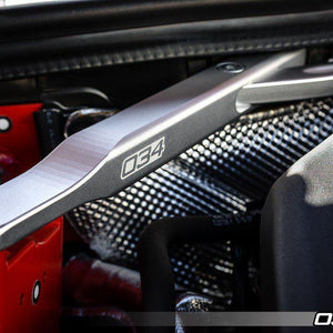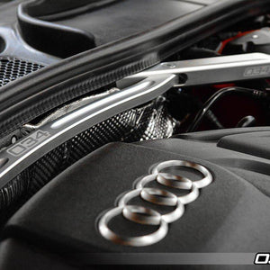 034Motorsport is proud to offer our Billet Aluminum Front Strut Brace for the B9 Audi A4/S4, A5/S5/RS5 & Allroad! The factory Audi strut brace is made of thin stamped aluminum, allowing for lateral deflection of the strut towers and chassis flex under hard cornering. This deflection can be observed as imprecise steering input and a vague, disconnected feeling from the front end.