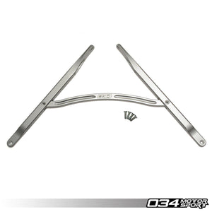 The 034Motorsport Strut Brace replaces the flimsy individual factory braces to improve the B9 A4's steering feel and handling performance. This robust chassis reinforcement is machined from T6-6061 billet aluminum, and engineered to be a comprehensive upgrade by limiting lateral strut tower deflection and maintaining proper suspension geometry under heavy cornering. The incorporated center brace ties together both left and right strut tower to provide precise, consistent feedback from the front end and ensures that you enjoy a more connected driving experience.